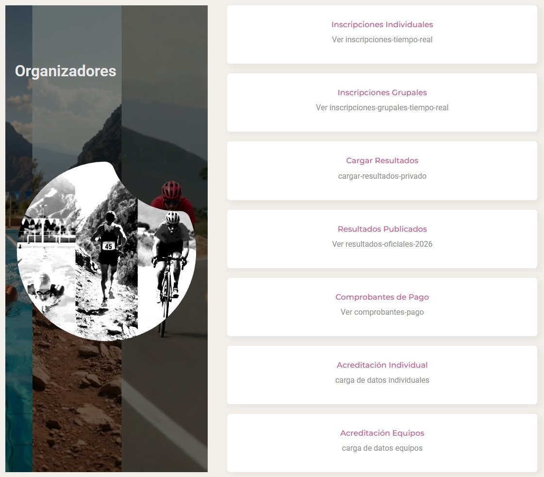 ⚠️ Importante: El sistema gestiona la carga y publicación de los tiempos, pero no incluye servicio de cronometraje. Los tiempos son registrados por el organizador mediante sus propios medios (cronometraje manual, chip timing u otro servicio externo) e ingresados al sistema para su clasificación y publicación.